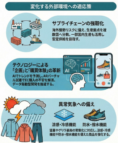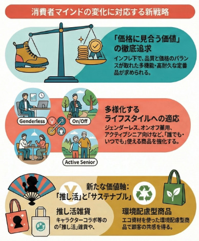 • 気候変動への適応: 猛暑日の増加、春秋の短縮など気候サイクルが変容しており、夏物のロングラン販売や異常気象への対応商品(冷感グッズ、レインウェア)の重要性が高まっています。